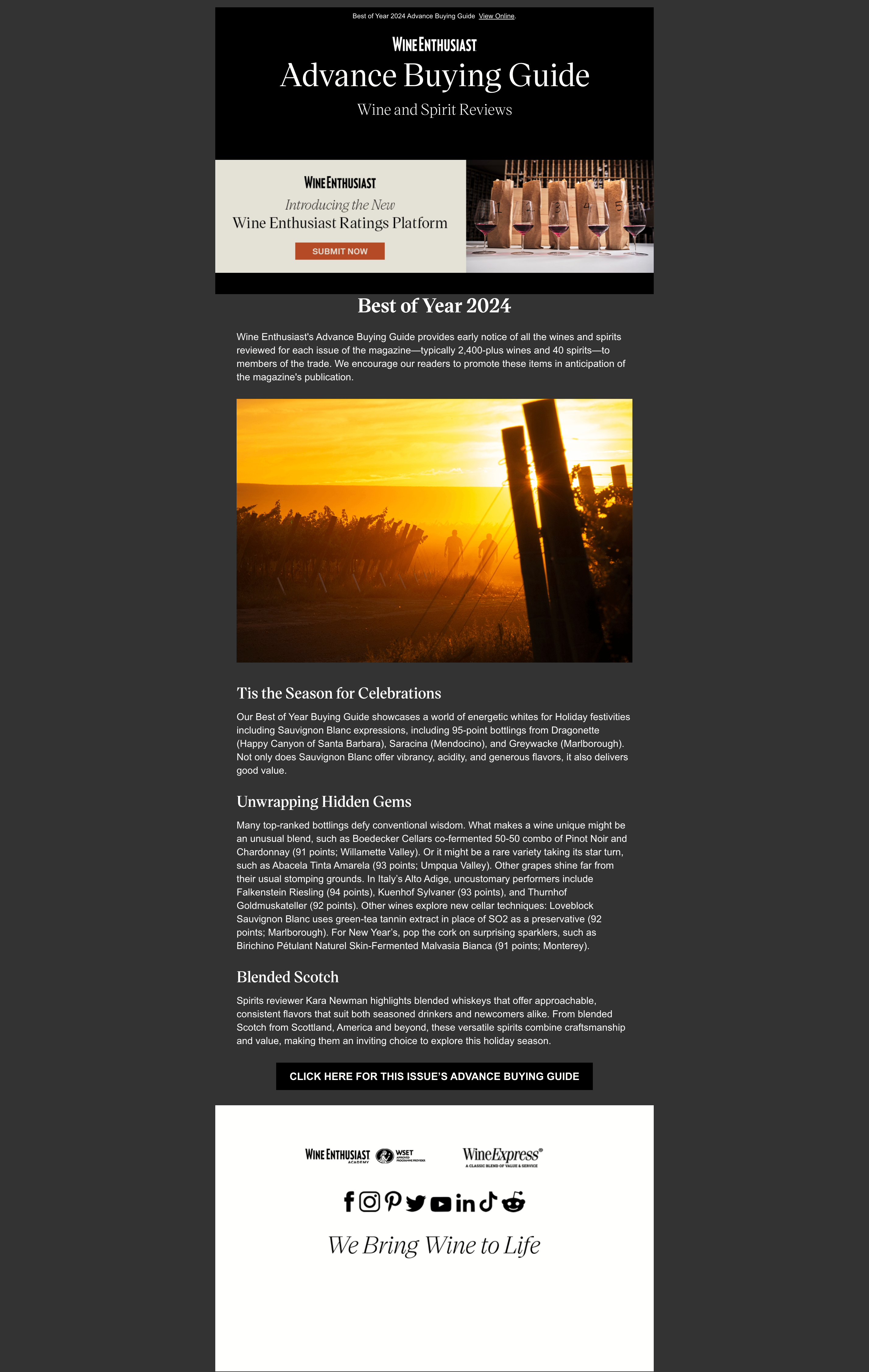 Take full advantage of your Wine Enthusiast rating with exclusive placement in print, digital, and email marketing channels designed to increase visibility and drive sales.